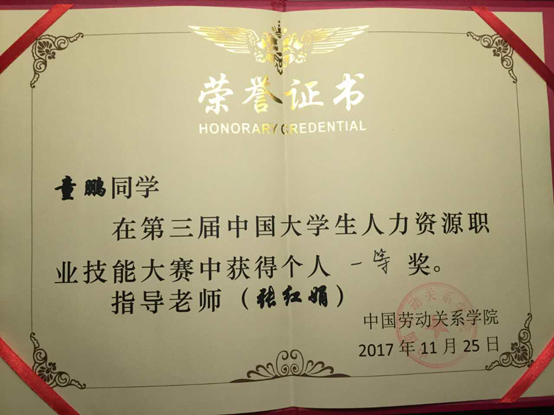 2016级的童鹏同学和南开大学的吴思菡同学夺得了本环节一等奖;案例讨论环节由2014级周模同学夺得本环节二等奖;情景模拟环节由2014级学生张建平参赛并夺得三等奖;负责参加人力资源实务设计环节的2014级学生朱琳获优秀奖。