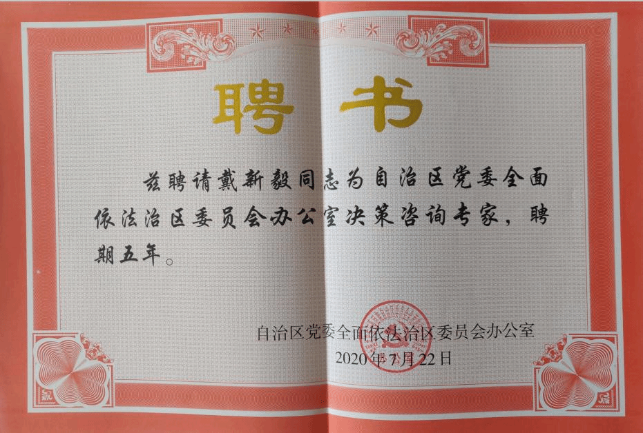 法学学科负责人戴新毅教授做了交流发言,戴新毅教授、滕明荣教授、张驰副教授、胡世恩副教授四名专家受聘为自治区党委全面依法治区委员会办公室决策咨询专家。