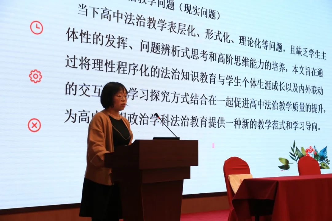 盐池高级中学田玲老师就《基于CIP生涯理论的高中法治教育探微——以高中政治教学为例》进行发言。依托生涯教育CIP信息加工理论与高中法治教育相结合,剖析了高中思政法治教学中的理论知识学习,法治践行能力提升以及法治理念价值引领的教学内容设计与模式,对提高学生对现实法治问题的抉择和解决能力具有启发意义。
