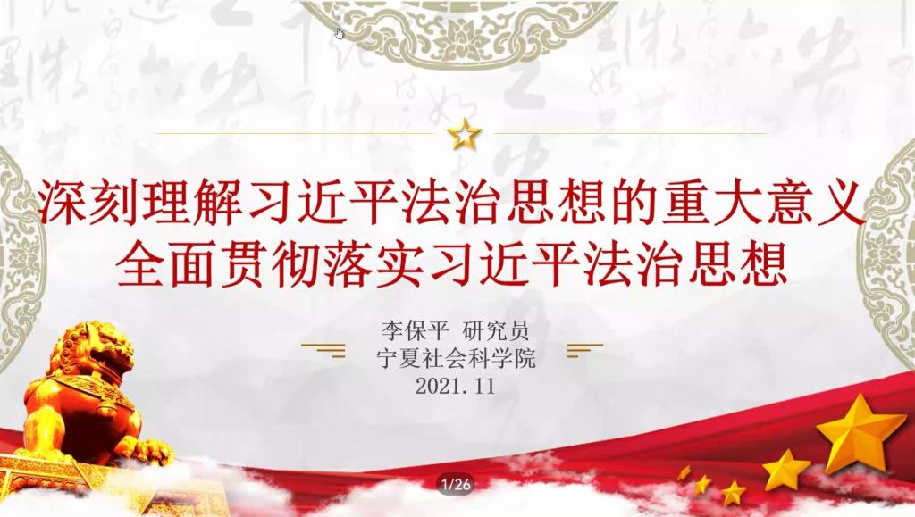 于11月3日下午组织开展《习近平法治思想概论》课程第二讲“习近平法治思想的重大意义”线上学习。本次讲座由宁夏社科院法学与社会学研究所所长李保平研究员主讲,18av动漫