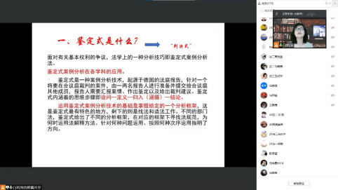白利萍老师首先为大家讲解了基本权利宪法保障的内涵及基本权利与一般权利保护的异同,介绍了鉴定式这一来源于德国法庭报告的教学法及鉴定式在我国法学各学科运用的基本情况,认为鉴定式是法学实践性教学的一种方法教育,强调宪法教学引入鉴定式的积极意义。接着,白利萍老师通过三个典型案(事)例引出现实中涉及基本权利保护的争议问题,为学生深入细致地讲解了宪法鉴定式三阶层分析框架的应用,宪法鉴定式三阶层分析框架即基本权利的保护范围、基本权利的限制及基本权利的正当性三个阶层逻辑上逐步推进审查,针对的问题是“判断基本权利的限制行为是否合宪?”,分析框架是理解基本权利保护的一种思维技巧,有其优点,但宪法基本权利的保护还有其他论证路径。最后,白利萍老师还对宪法鉴定式三阶层分析框架在单项基本权利的运用及本土化等问题作了解读,认为还可以与我国宪法实施中的合宪性审查等制度相结合,加深对疫情防控中基本权利保护和限制问题的理解。讲座结束后,滕明荣教授就讲座的相关主题进行了互动交流,认为通过知识体系的沟通使得教师间的合作交流增强了,并与白利萍老师一起回答学生提问,让学生对宪法价值和精神更能直观的感受和理解。