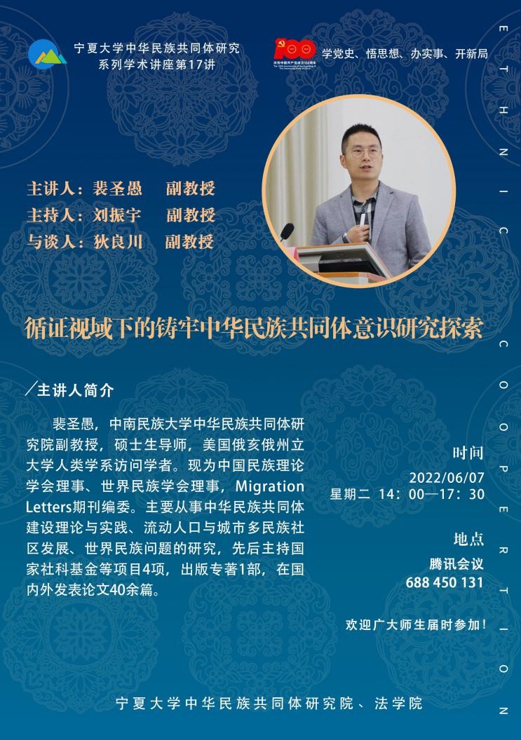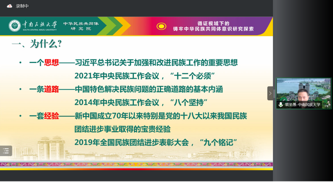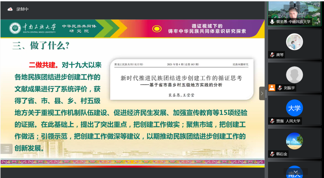 “2022年度铸牢中华民族共同体意识教育项目——铸牢中华民族共同体意识学术讲座(研讨会)之四”在线上举行。本期讲座特邀中南民族大学中华民族共同体研究院副教授、硕士生导师裴圣愚为主讲人,学院副院长刘振宇副教授主持,狄良川副教授为与谈人,民族学学科师生聆听学习。