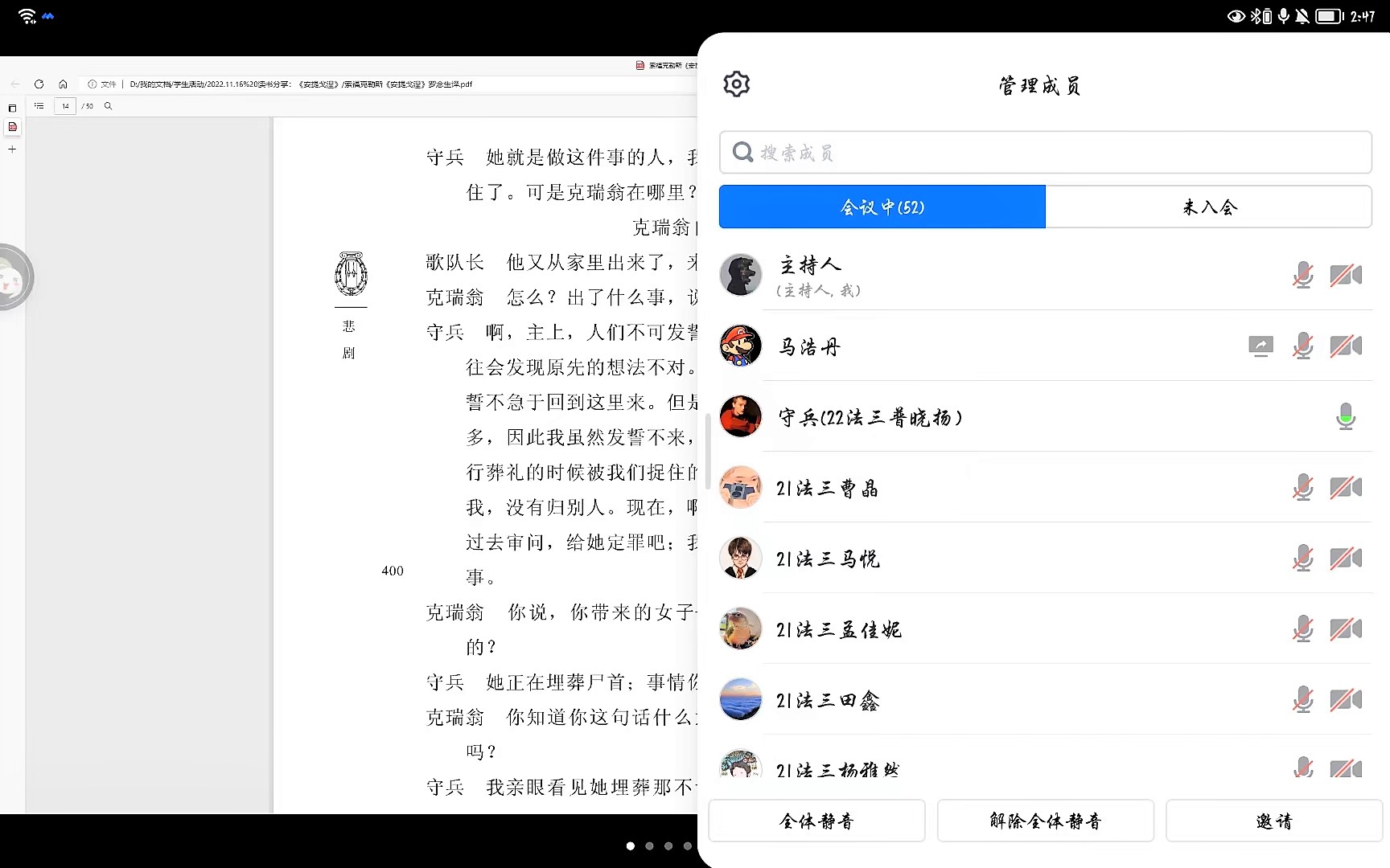 首先,马浩丹为同学们简单介绍了《安提戈涅》的故事梗概和作者生平,以及故事发生的历史背景和社会环境,为同学们身临其境的欣赏作品奠定了良好基础。随后,同学们分别扮演剧中角色,朗读了《安提戈涅》剧本,情感真挚、栩栩如生,为与会人员带来了一场视听盛宴;朗读结束后,马浩丹又分别从政治学、法学、文学的角度分析了《安提戈涅》的意义,从故事到现实、从古今到中外,言简意赅,通俗易懂,但又鞭辟入里,引人深思。