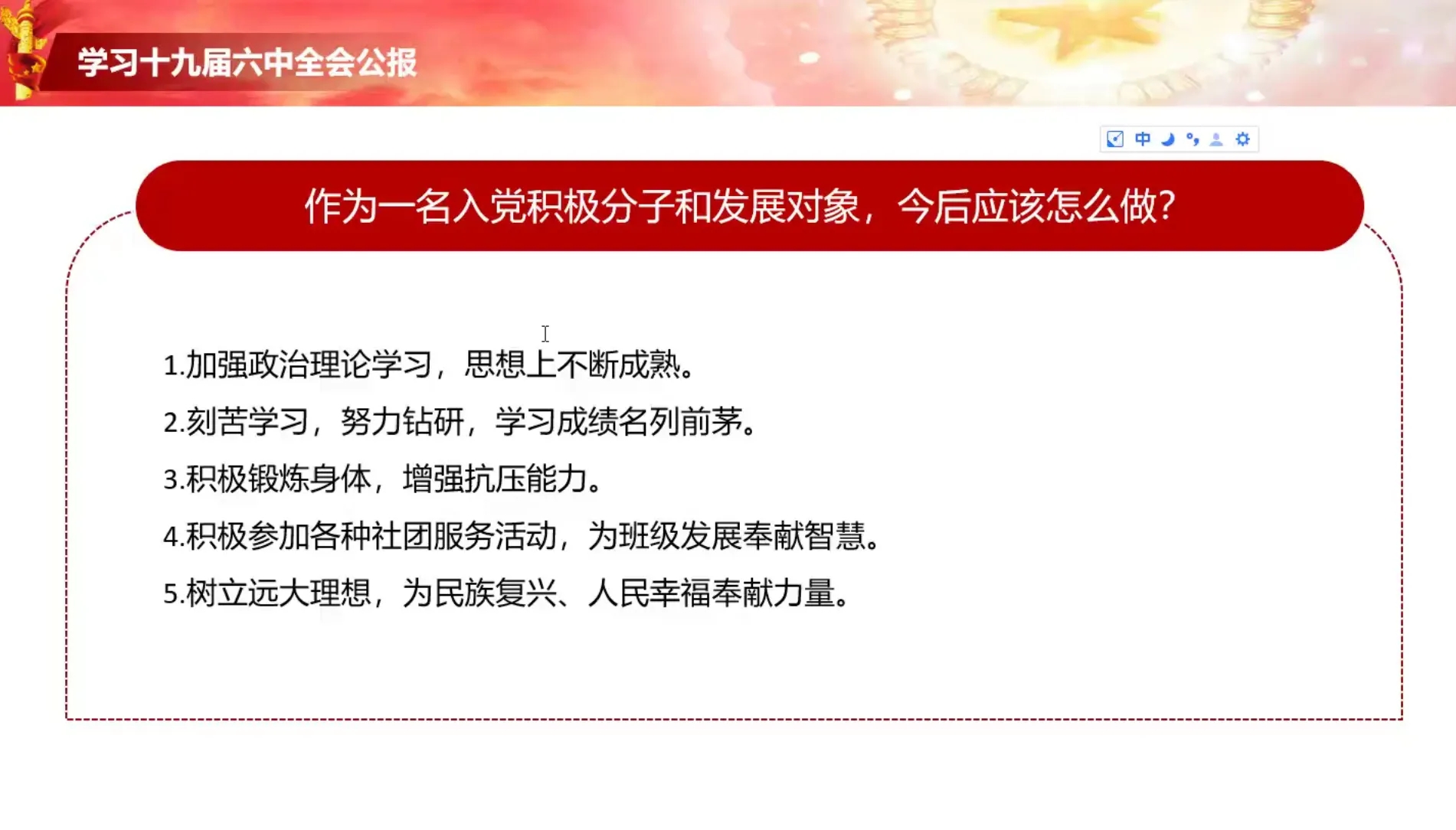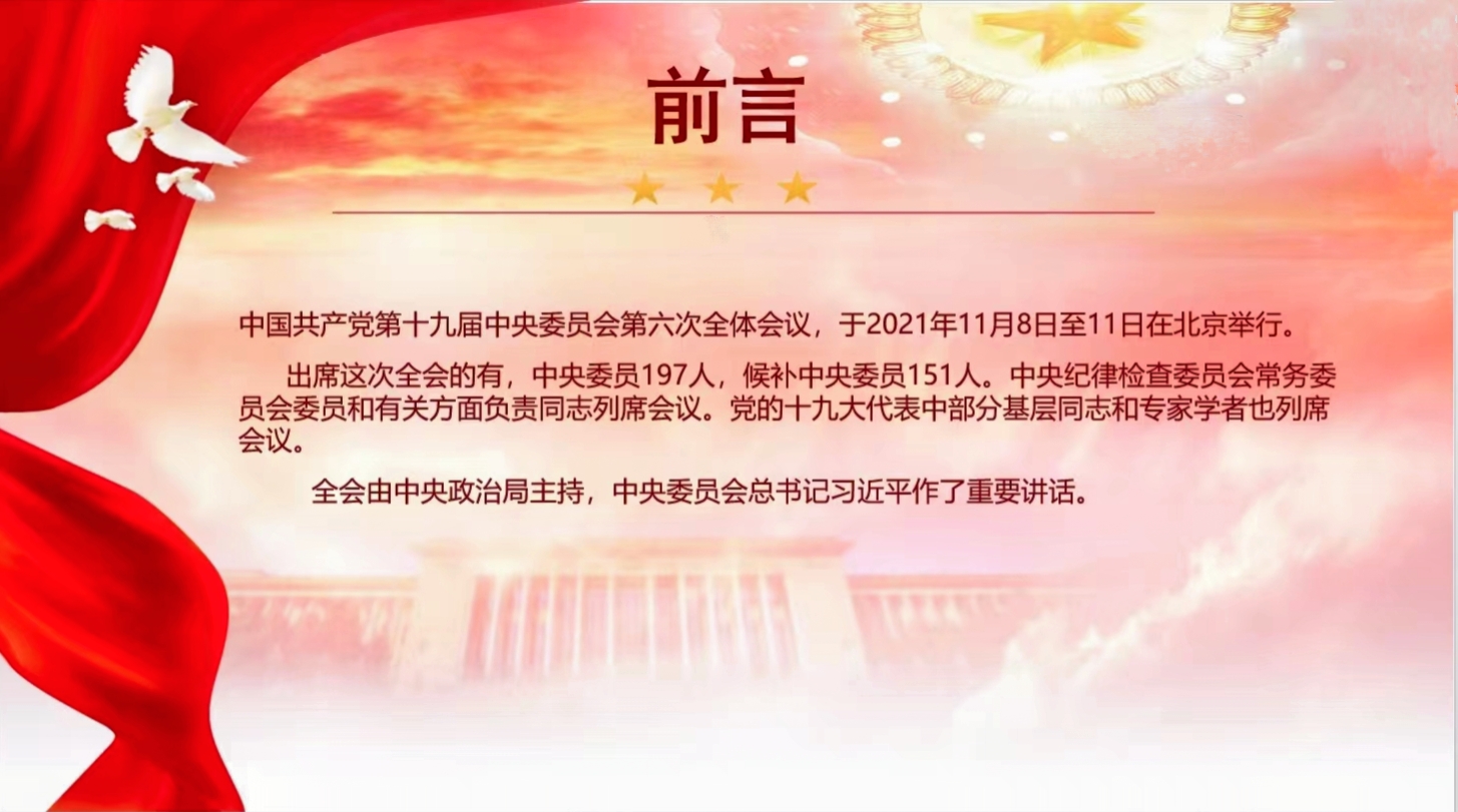 本次党课加深了学员们对党的十九届六中全会报告内容的理解,强化了学员们对中国共产党的历史和伟大贡献的认识。相信学员们在接下来的学习生活中,能够将党的十九届六中全会精神内化于心、外化于行,自觉做党的忠实拥护者、执行者,做新时代中国特色社会主义的合格建设者和接班人。