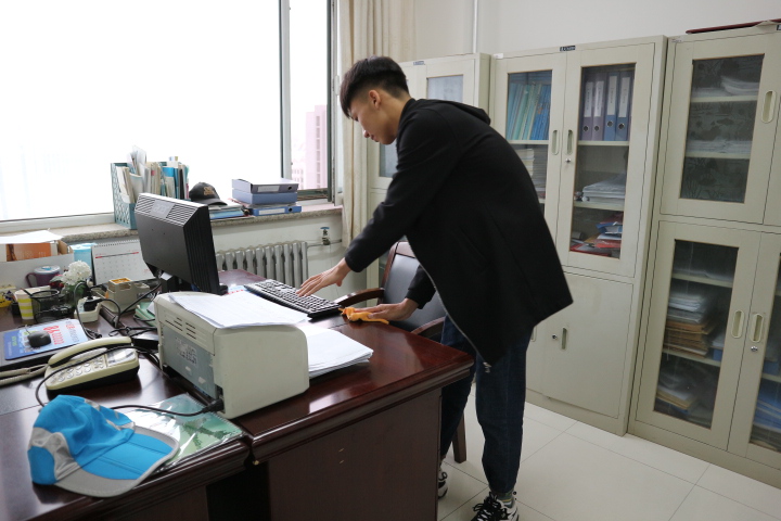 在志愿者服务部干事的细心策划与合理分工后,活动正式拉开帷幕。一部分志愿者进入学院各行政办公室打扫地板、办公桌桌面以及办公室的每个死角,希望通过此次行动能为老师们创造良好的办公环境;另一部分志愿者到学院会议室和模拟法庭进行黑板、桌椅、地面等清扫工作。在打扫卫生的过程中,志愿者们学着干、抢着干,一个个干劲十足、毫不懈怠,积极用实际行动诠释着“雷锋精神”。