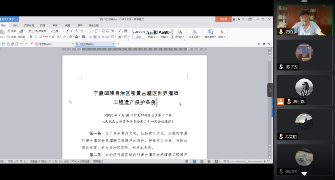 上午,朱赟主任结合我区地方立法实践,通过立法体制、立法权限、立法程序、立法监督四个方面对立法原理进行了全面阐述。下午,朱赟主任结合最新出台的《宁夏回族自治区引黄古灌区世界灌溉工程遗产保护条例》,针对立法技术规范的要点与同学们进行线上研讨。在讲座上,有九名同学就优化营商环境、黄河流域生态保护立法、宁夏回族自治区野生动物保护实施办法的修订计划、《宁夏回族自治区公安机关警务辅助人员管理条例》(草案)以及备案审查制度等立法热点问题向朱赟主任提问。朱赟主任针对目前的立法工作和实际情况对同学们的问题一一解答。