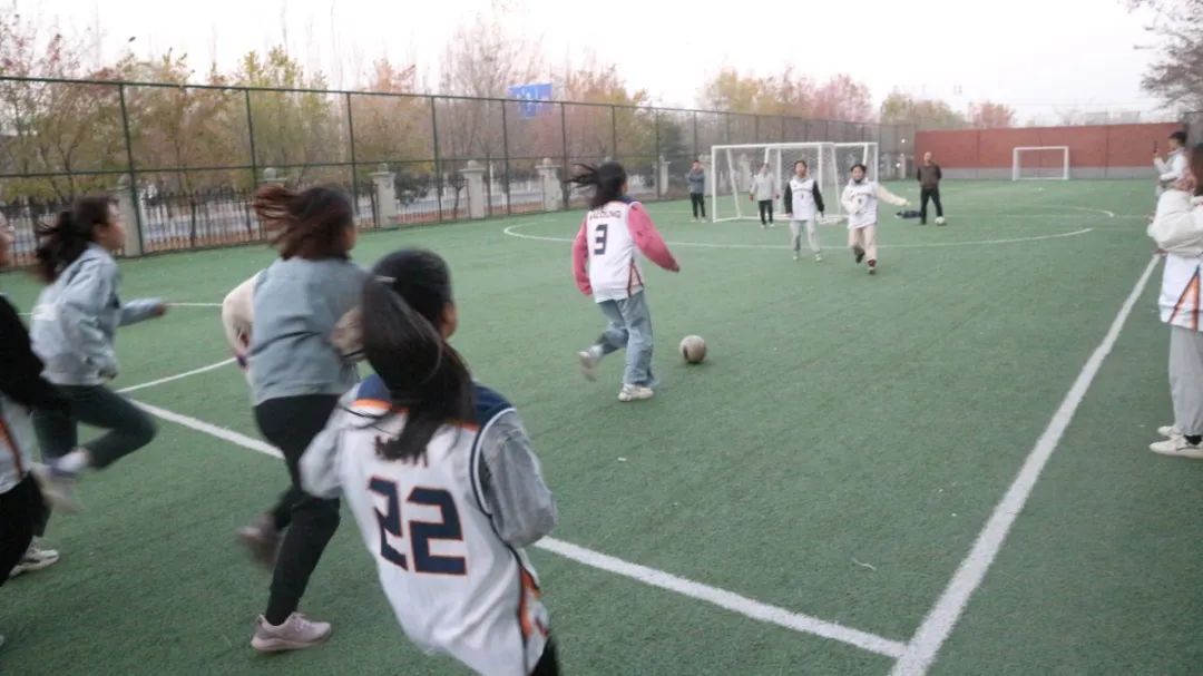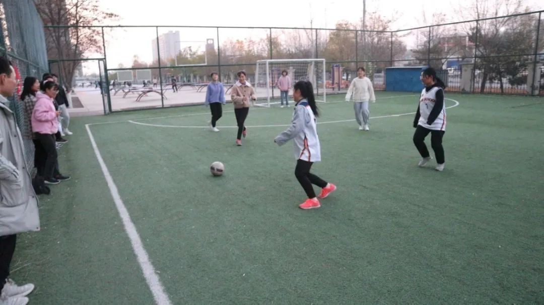裁判员哨声响起,双方球员迅速进入状态。她们默契配合、巧妙进攻,完成了一次又一次精彩的进球。场外的“后援”也不甘示弱,一声声喝彩与鼓励响彻操场。