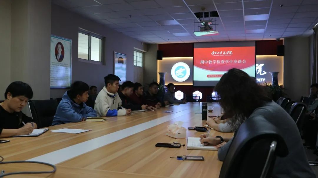 于文荟楼801会议室开展期中教学检查学生座谈会。学院党委书记潘瑞、院长吕耀军、副书记杨扬、副院长马金龙、教学办主任武玲娥出席本次座谈会。18、19、20级学生代表参加此次座谈会。