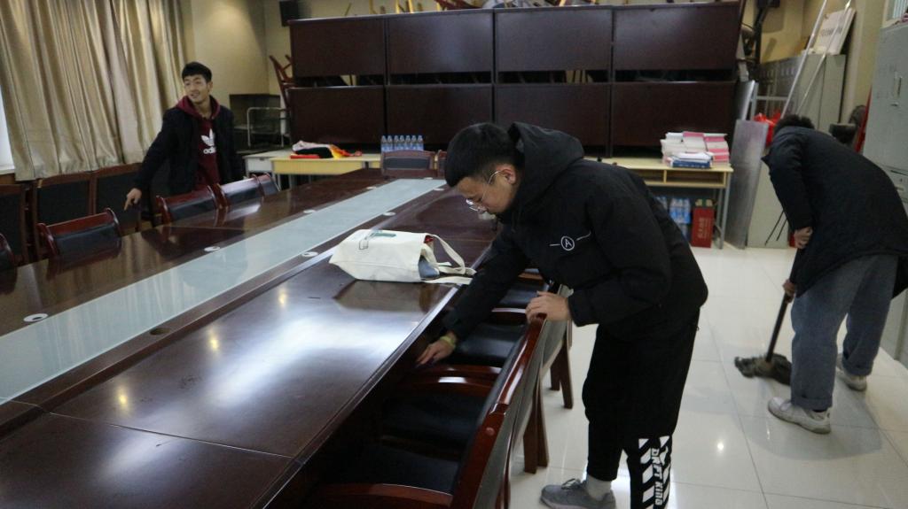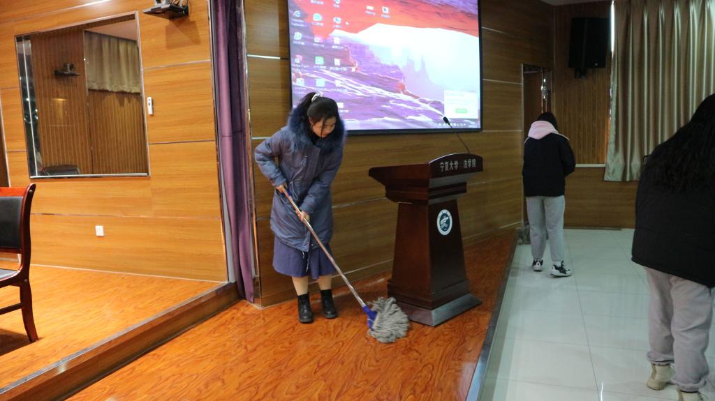 组织青马班学员于文荟楼2楼模拟法庭和204教室开展志愿清扫活动。