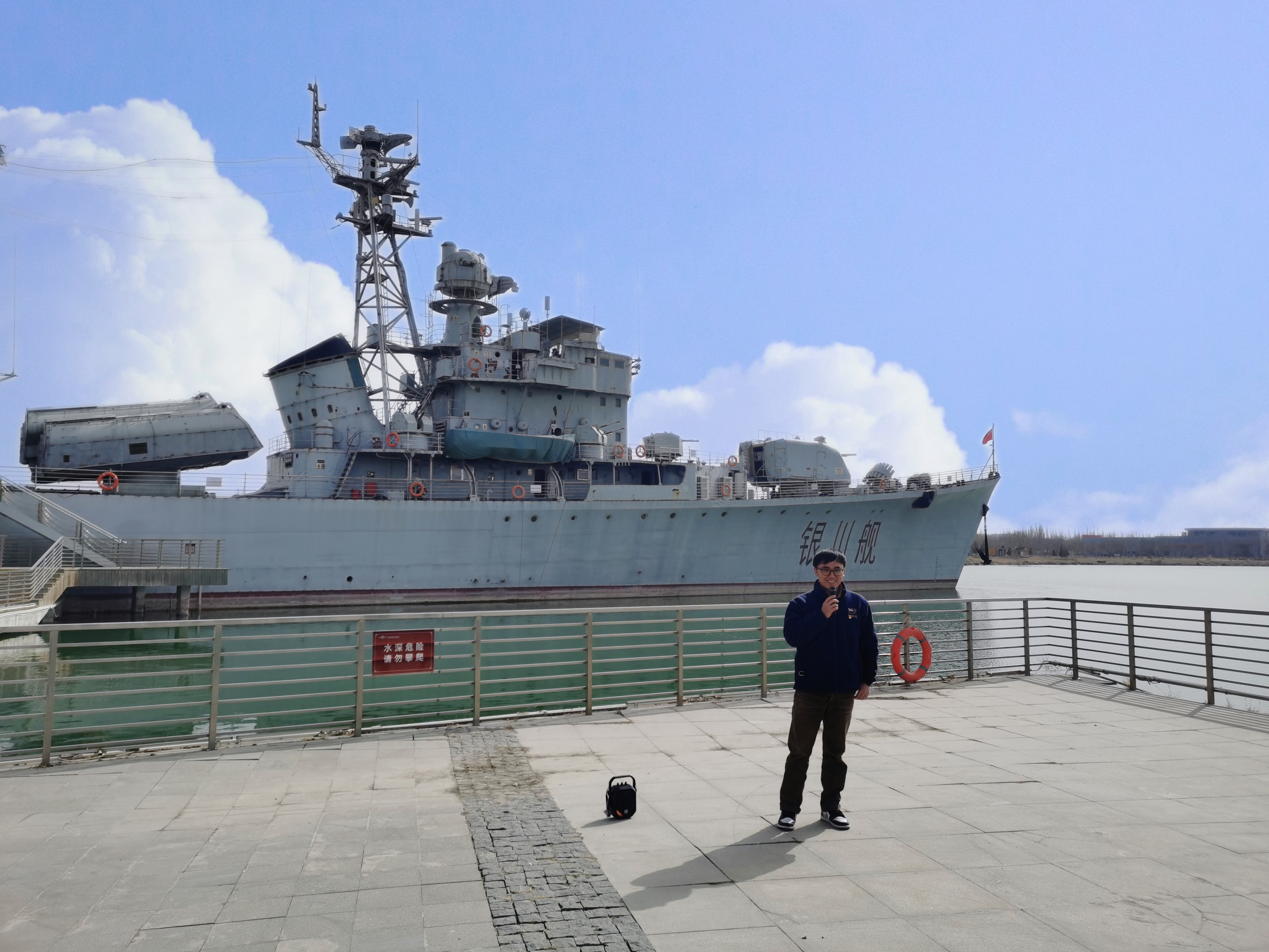 黄河军事文化博览园位于银川滨河新区,园区的军事主题特色十分突出,退役的舰船、潜艇、飞机、大炮依次陈列,在讲解员的带领下,同学们全方位参观“银川号”军舰和潜艇,了解“银川舰”服役30多年来的光辉历程,切实感受“听党指挥忠于党、能打胜仗打硬仗、作风优良为人民、爱舰爱岛爱海洋”的人民海军精神。