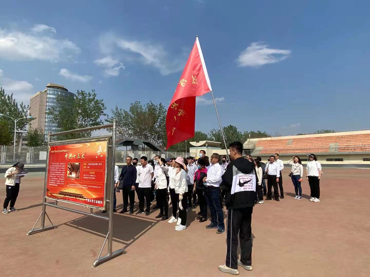 教师积极参与,统一着装、精神焕发,高举院旗、步伐矫健,团结互助、奋勇争先,按照组委会提供的定向地图在怀远校区的19个集结点依次打卡,并完成各集结点“中国共产党人的精神谱系”及党的一大到党的十九大的核心精神学习任务。