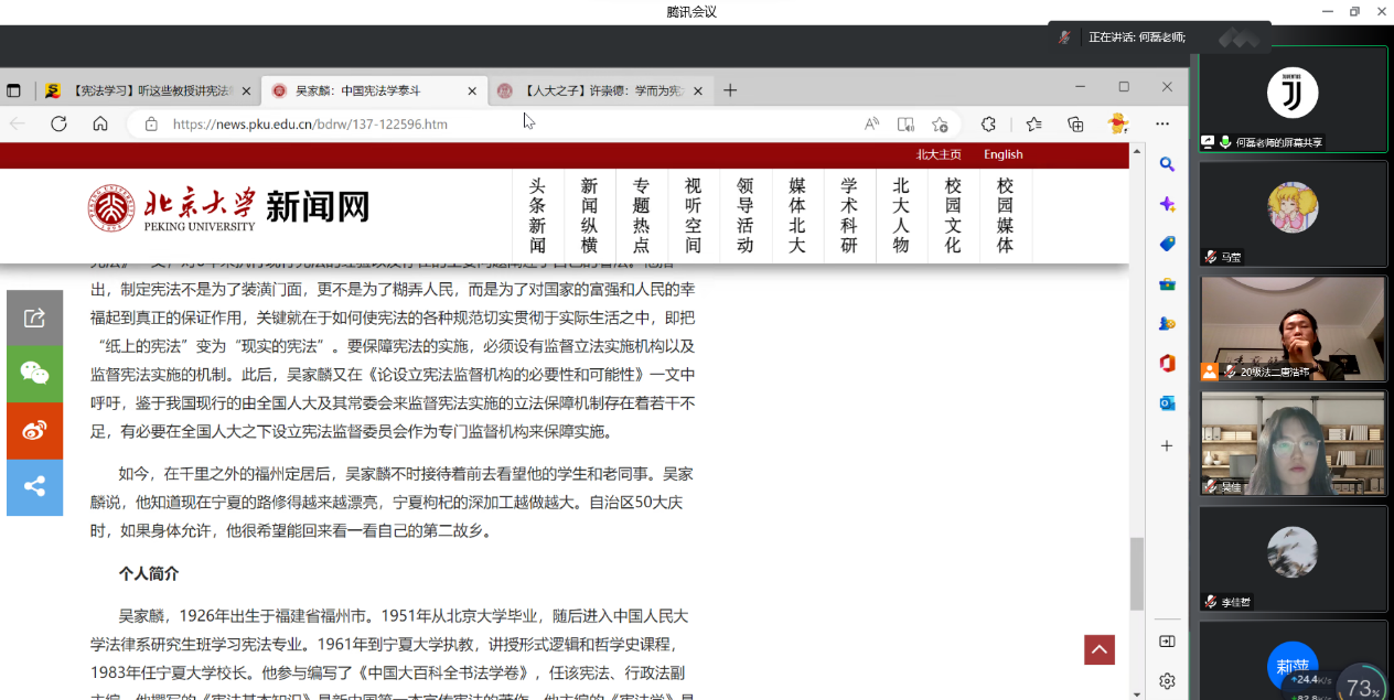 主题活动分为两个部分,第一部分活动是吴家麟老先生和许崇德老先生的学术生涯回顾。在何磊的讲述中,同学们了解到:吴家麟老先生1926年出生于福建省福州市,享年91岁。1951年从北京大学毕业,随后进入中国人民大学法律系研究生班学习宪法专业,同年,调入本校国家法教研室任教。1961年到18av动漫